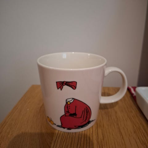Arabia Muumi muki Pikku myy. Muki on alunperin lastenastiasto setistä ja näin ollen mukissa ei ole alunperinkään ollut tarraa.
