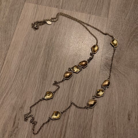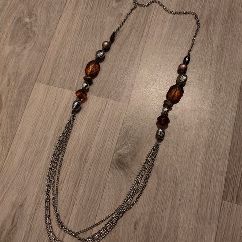 Koristeellinen pitkä kaulakoru. Ei tietoa merkistä tai materiaalista.