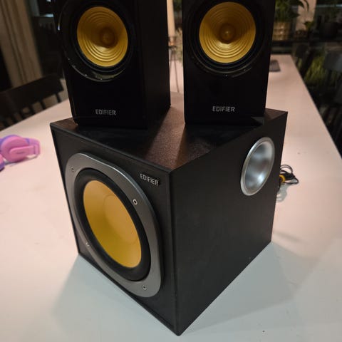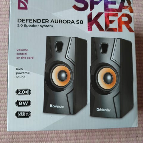 Defender kaiutin ihan hyvässä kunnossa mutta vasemmasta yläreunasta haljennut palanen mutta ei vaikuta toimimiseen mitenkään, hyvin toimii muuten, voi myös vaihtaa ledejä.