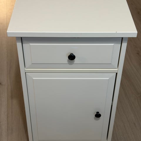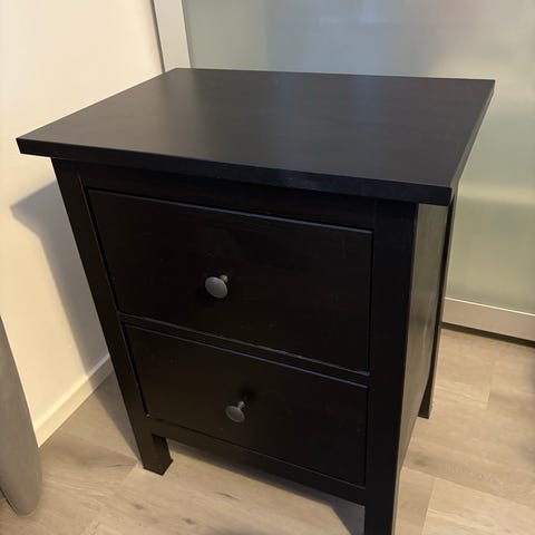 Ikean musta Hemnes-yöpöytä ankkavetimillä. Kulumia löytyy reunoista ja kulmista jonkin verran. Alkuperäiset nupit saa halutessaan mukaan mutta ankka on jättänyt laatikoihin jäljet jotka näkyvät kun ne irrottaa (kuva).
