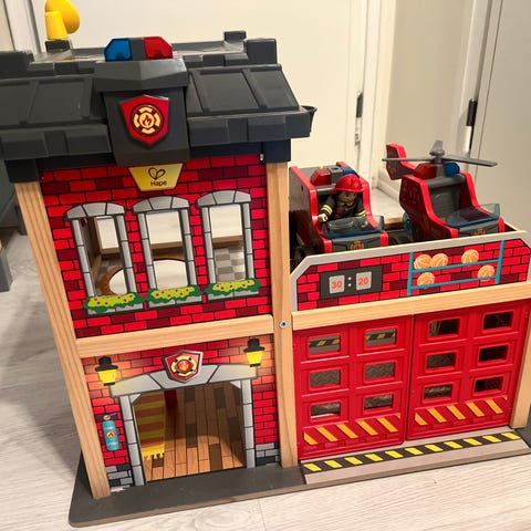 Iso ja tukeva puinen leikkipaloasema avautuvilla ovilla, tarvikkeilla ja hahmoilla. Hyvä kunto. Pientä normaalia kulumaa, ei häiritse silmää.