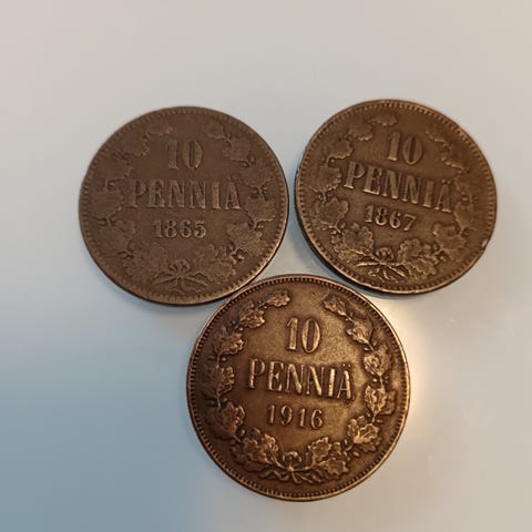 Kaksi 5 pennin kolikkoa vuosilta 1906 ja 1908