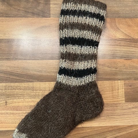 Myyn äitini puolesta hänen neulomansa villasukat. Koko n. 41-42. Lanka ohuempi sukkalanka kuin 7-veljestä - mukava ja istuva jalassa. Postitus kirjeenä sis. hintaan.