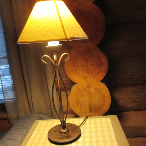 Myyntiin kevyt pöytävalaisin suurella varjostimella, halkaisija 27.5cm. Varsi metallia ja pohja puu/kangas yhdistelmä. Kokonaiskorkeus lampulla n. 34cm.