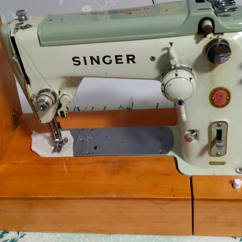 Singerin kone jossa on lamppu ja metallirasia ja muita osia.