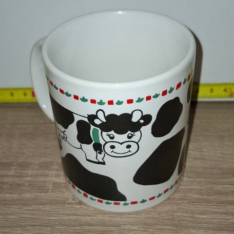 Myydään musta valkoisen lehmä aiheinen muki.itsellä olnut koristeena hyllyllä.