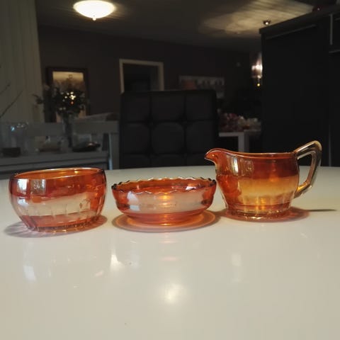 Hakusanat: lysterilasi, Paketoitava, keittiötarvikkeet, vintage huonekalut, koristekuviot, vintage, lasi, tarjoilu, sokerikko, kermakko, astiat, kahviastiasto