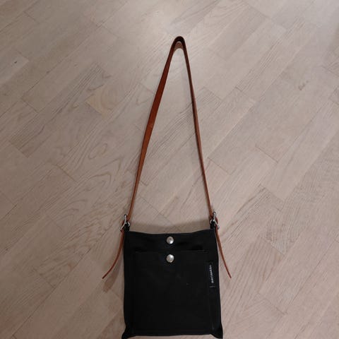 Paljon käytetty musta Pasi-laukku. Väri haalistunut, mutta täysin ehjä.