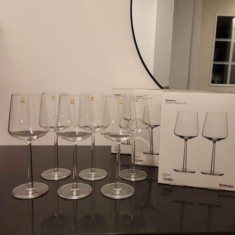 Myydään siistit Essence punaviinilasit. Toisessa lasissa myös tarra vielä paikallaan.