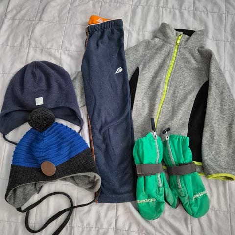 Didriksons tummansiniset fleecetakki ja -housut koossa 90. Kunto hyvä, pientä nukkaantumista kankaassa.