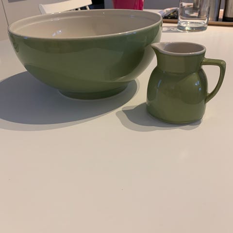 Hyväkuntoiset Kermansaven kulhot käsinmaalatulla puolukka -kuviolla. Pohjissa hieman tarrajäänteitä. Korkeus 7,3 cm, yläreunan halkaisija n. 9 cm.