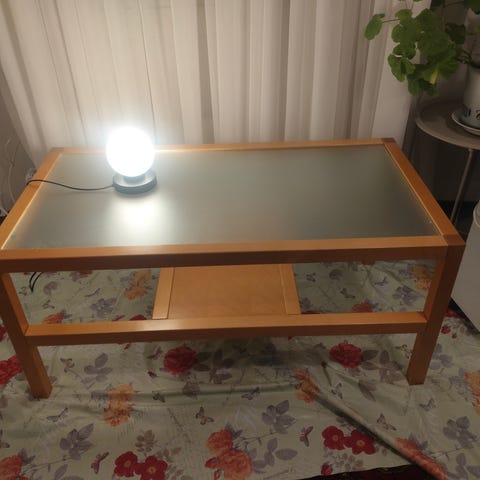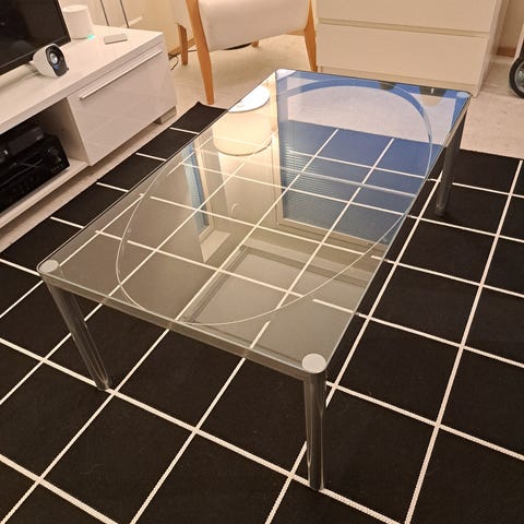 Ikean lasinen ja metallinen sohvapöytä. Pöytä on lähes kuin uuden. Se on hankittu 2005 ja pidetty siistinä. Lasilevy on panssarilasia ja kestävät hyvin