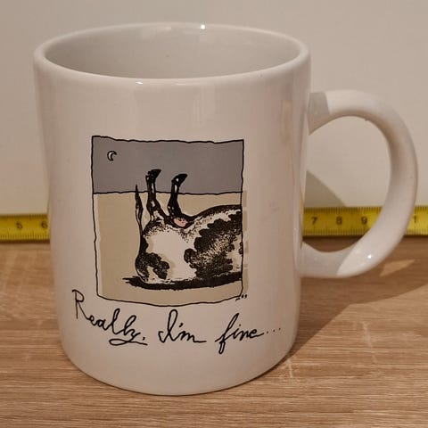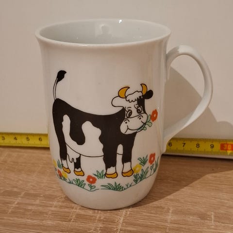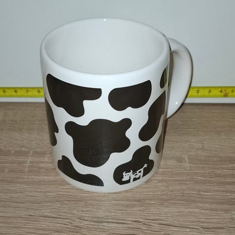 Myydään musta valkoisen lehmä aiheinen muki.itsellä olnut koristeena hyllyllä