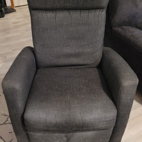 Vaaleanharmaa hyväkuntoinen mekanismituoli. Miellyttävä kangaspinta ja vaahtomuovipehmuste. Materiaali kangas.