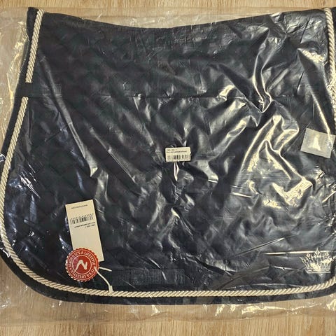 Kerran kisoissa käytetty satulahuopa. Valkoinen, mustalla kanttauksella ja strasseilla. Satulasta jäänyt pienet jäljet huopaan.