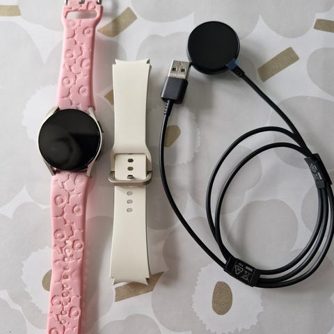 Samsung Galaxy Watch6 älykello valkoisella hihnalla ja mukaan kullanvärinen hihna. Kyseessä on LTE -malli, eli tähän saa liittymän esimillä.