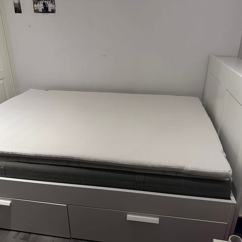 Myydään muuton tieltä pois säilytyslaatikoin varustettu Ikean Brimnes sänky. Mukaan myös Ikean pussijousitettu Vesteröy-patja sekä Ikean Tuddal-petauspatja. Patjan koko 140 cm x 200 cm.