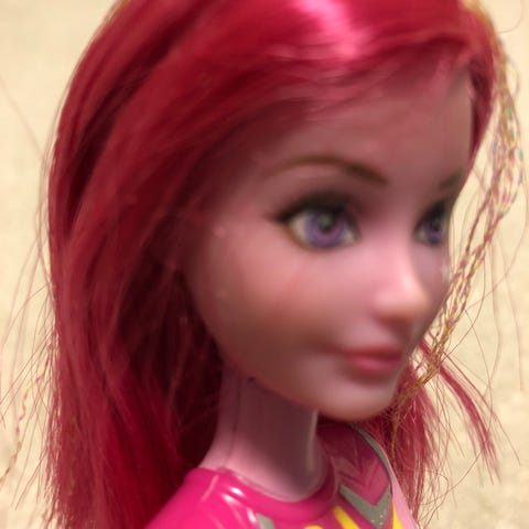 Barbie nukke pukeutuneena violettiin mekkoon ja koruihin. Nukella on pitkät violetit sukkahousut ja ruskeat hiukset. Nukke soveltuu leikkeihin ja keräilyyn.