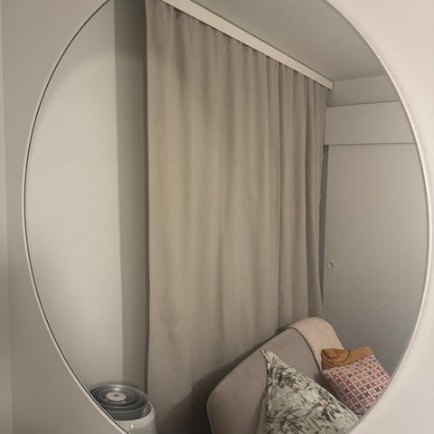 IKEA Lindbyn pyöreä peili, jossa musta kehys. Peilin halkaisija 80cm. Sopii seinälle ripustettavaksi.