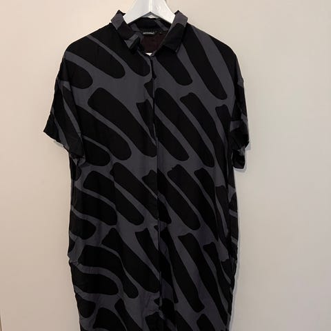 Marimekon Vintage midimekko, koko 36. Yleisilme hyvä, mutta paikotellen näkyy käytönjälkeä. Nappilistan kohdalta vahvistettu, näkyy kuvista, tämä jää piiloon nappien taakse. Pituus noin 117cm ja kai kai mitta noin 51cm. Kauniisti laskeutuva materiaali.