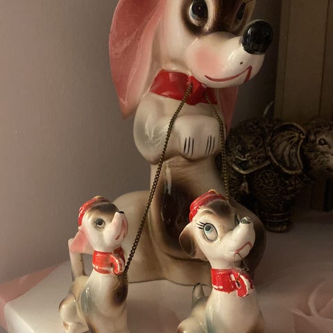 Kuvienmukaiset virheettömät emo ja pennut 1950 luvun vintage koirafiguurit 3 kpl.