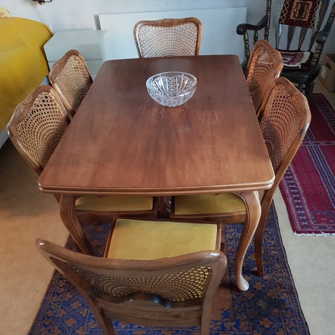 Iskun massiivipuinen ruokailuryhmä neljällä tuolilla. Pöydän pinnat siistissä kunnossa. Tuoleissa selkänojien yläosassa pientä kulumaa, näkyy kuvissa.