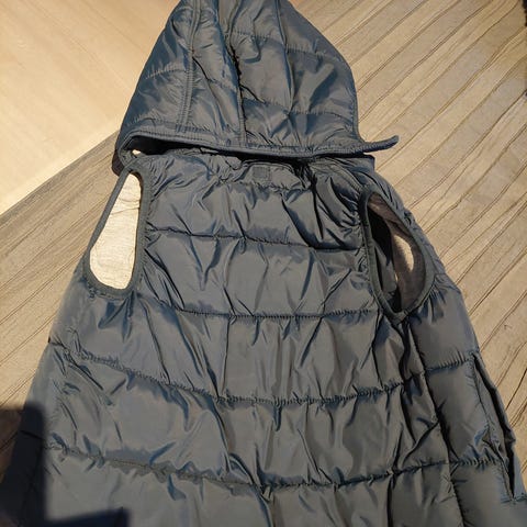 Sininen lasten toppaliivi, koko 104, suunniteltu pojille. Liivi on toppausta sisältävä ja siinä on hupullinen malli. Soveltuu käytettäväksi ulkovaatteena viileämmissä olosuhteissa.
