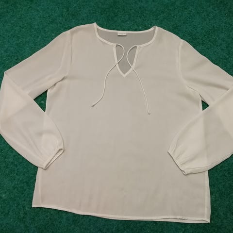 Hihaton luonnonvalkoinen sifonkipusero hieman pidemmällä helmalla. Koko 40. Mitat kainalo-kainalo 53cm, olka-helma edestä 68cm ja takaa 74cm. Erittäin siisti kunto.