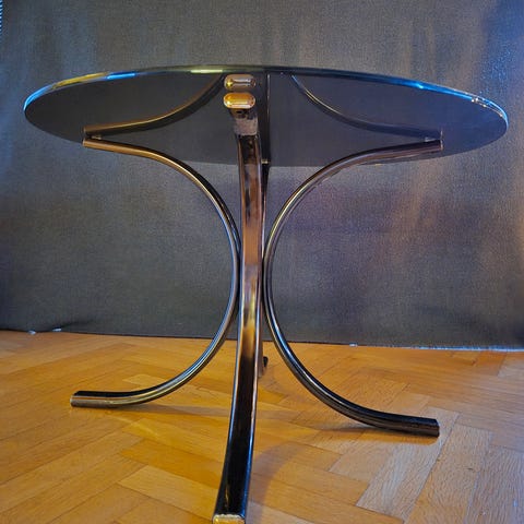 Vanha lasipöytä metallisilla jaloilla. Jalkojen materiaali on ilmeisesti eloksoitua alumiinia, ja sen pintakäsittelyssä on kulumaa. Pöydän päällä irrotettava savulasinen lasitaso.
