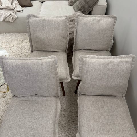 Kasattujen tuolien päälliset on juuri pesty, mutta ovat olleet käytössä koirataloudessa, jossa on kaksi pientä koiraa.