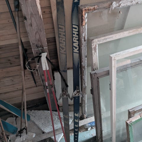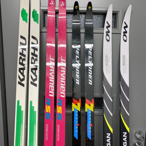 Vanhat kilpasukset, 188cm, 73-78kg hiihtäjälle. Sauvat myyty.