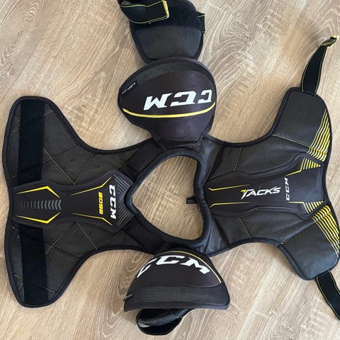 CCM AS1 rinta panssari, koko YT large ja kyynärsuojat YT medium. Oikein hyväkuntoiset seuraavalle pienelle pelurille.