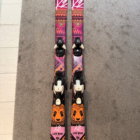 K2 Luv Bug 100 lasten laskettelusukset. Sukset ovat väriltään oranssi-violetti ja niissä on kiinnitykset lasten laskettelumonoille. Sukset soveltuvat lapsille ja niissä on helppokäyttöiset siteet.