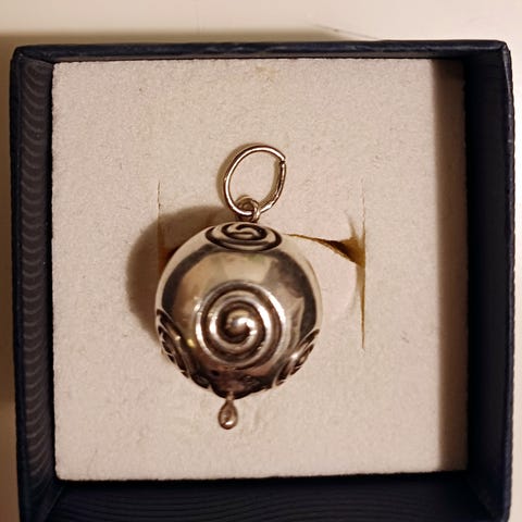 Kalevala Korun Halikon kääty spiraalipalloriipus. Myynnissä pelkkä riipus, ei ketjua. Hopeaa, leimat alaosassa. Valmistusvuosi 1976 tai 1978 (V7 tai Y7). Tummunut, mahdollinen puhdistus/kiillotus jää ostajalle.