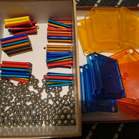 Iso paketti geomageja, kuulia ja magneettitankoja molempia n. 200 kpl. Lisäksi geomag gravity sarja ohjeineen ja paljon myös levyjä erilaisiin rakenteluihin.