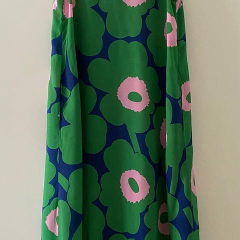 Uusi Marimekon Tyväri unikko mekko. Koko 42. Kuproviskoosista valmistetussa Tyväri-mekossa on niukka istuvuus ja A-linjainen leikkaus. Mekossa on venepääntie, reilun kokoiset sivusaumataskut, pitkät hihat ja irrallinen D-rengasvyö.