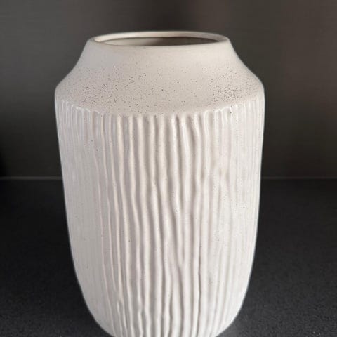 Jussis keramik koristevaasi, jossa ruskea lasitettu yläosa ja luonnonvalkoinen mattapintaisempi alaosa. Vaasissa on kaksi pientä kahvaa sivuilla. Kuin uusi.