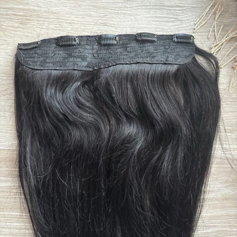 Hiuslisäke pysyy hyvin päässä pienten klipsien avulla. Todella luonnollisen näköinen. Voi myös leikata haluttuun malliin.