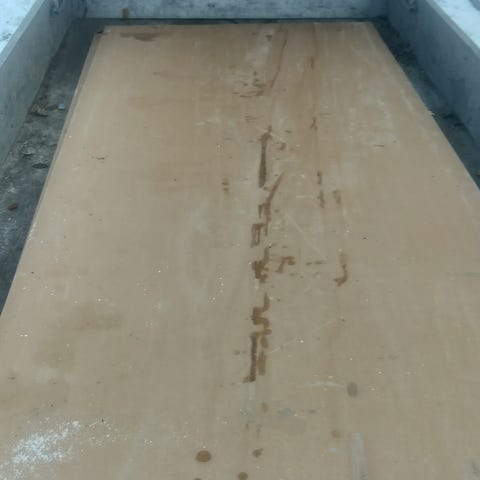 Kolme levyä on täysimittaisia ja käyttämättömiä (960 x 2800 x 4 mm). Neljäs levy on kertaalleen asennettu ja lyhennetty 2150 mm pituuteen – siinä on yksi reikä sähköpistoketta varten.
