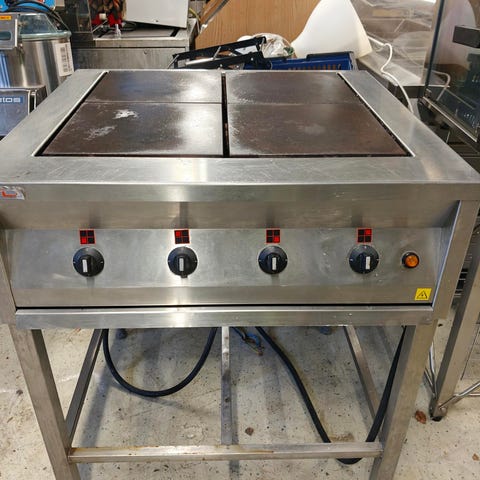 Royal Catering sähköliesi, jossa on neljä keittolevyä ja ruostumainen teräsrakenne. Liesi on tarkoitettu keittiökäyttöön ja siinä on neljä erillistä lämmityselementtiä ruoanvalmistukseen.