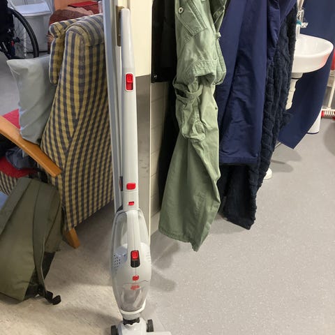 Volta Equipt pölynimuri, jossa punainen runko ja mustat yksityiskohdat. Varustettu joustavalla imuletkulla ja säädettävällä teleskooppivarrella. Soveltuu kotitalouskäyttöön lattioiden ja muiden pintojen puhdistamiseen.