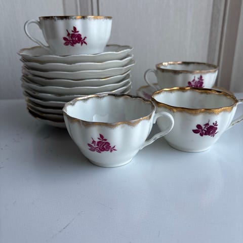 Setissä on 10 kuppia ja tassia. Kaikki ovat ehjiä ja hyväkuntoisia.