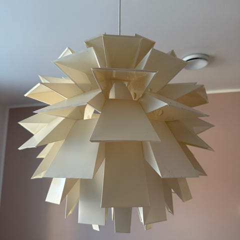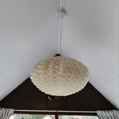 Myydään lampunvarjostin. Yhden lehdekkeestä pieni lovi irronnut.(kuvassa) Johtokupu ja Led valo mukaan.