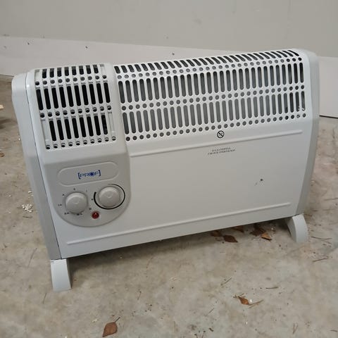 Valkoinen sähköpatteri, jossa on kiinteä virtajohto. Sopii lämmitykseen sisätiloissa.