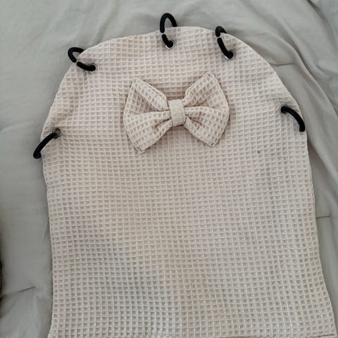 Uusi vaunuverho rusetilla mustasta vohvelikankaasta. Pienempi malli korkeus n.41cm ja leveys n.38,5cm. Verhoon voi valita joko pienemmät renkaat tai suuremmat.