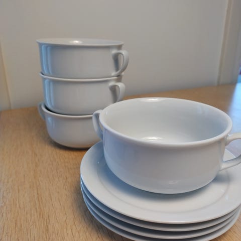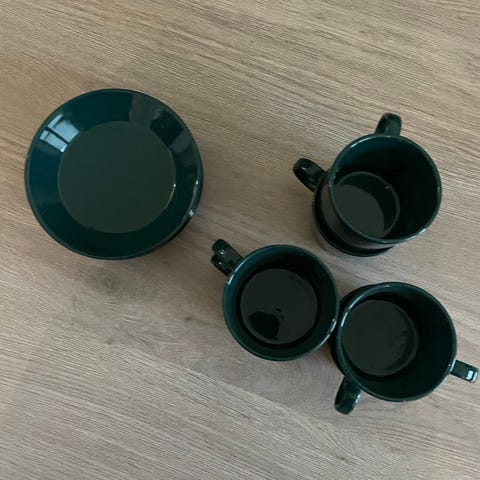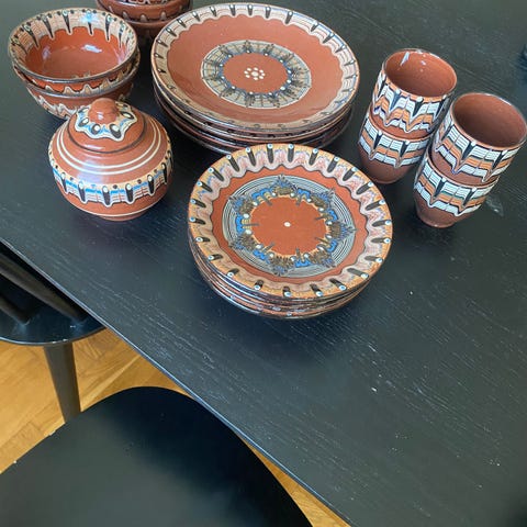 Myydään kuvan mukaiset astiat: mm. 6 hengen astiaston lautaset, leipälautaset, tarjoiluastioita, Kermansaven mukeja 4kpl, kuohuviinilaseja, kannu, lasipurkki, iso kulho. Kaikki kerralla.