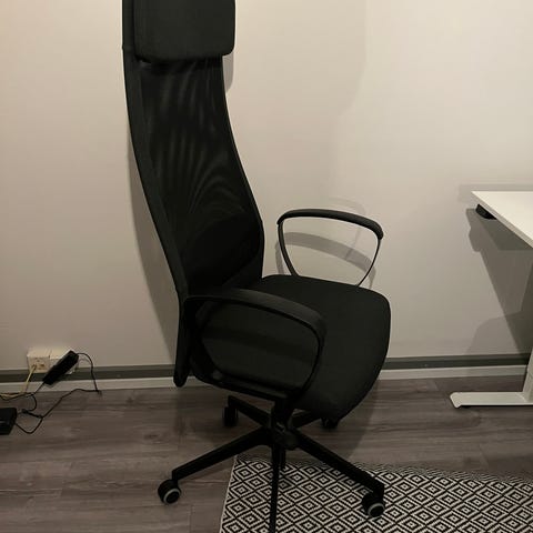 Erittäin siistikuntoinen ja mukava työtuoli/toimistotuoli keinonahkaisella verhoilulla. Säädettävä istuinkorkeus ja selkänoja. Mitat Ikean mukaan: istuinsyvyys 47cm, leveys 53cm, selkänojan korkeus 94cm, koko tuolin korkeus 129cm, leveys 69cm. Pieni nirhauma selkänoja yläosassa, tästä kuva. Nouto Mankkaalta. Koirakoti.