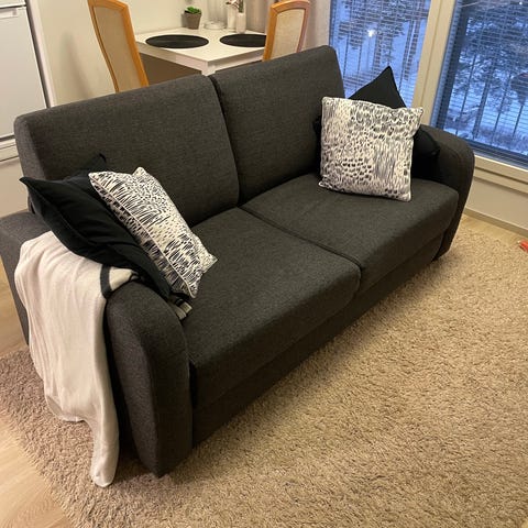 Harmaa vuodesohva jonka saa noin 140 cm sängyksi. Erittäin mukava, varsinkin makuuasennossa. Myydään muuton takia pois.