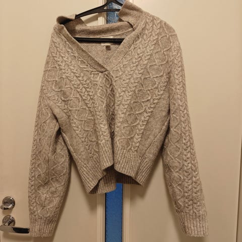 Kaunis väriltään (syklaami) ja kuvioltaan. Materiaali polyester+puuvilla. Pehmeä ja väljä, joten käy myös M-kokoiselle. Hyväkuntoinen ja vaatepaljoudessa käytetty vain muutamasti. Kamera vääristää värin liian voimakkaaksi, on oikeasti vaaleampi väriltään.