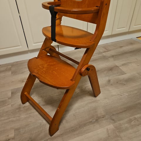 Tuolissa toki käytönjälkiä jo mutta muutoin täysin ehjä ja tää on "vanhan ajan" kunnon painavaa materiaalia eli ei keiku lapsen istuessa. Mielestäni parempi ollut kuin esim Stokke. Muoviosaa saa liikutettua eteenpäin lapsen kasvaessa ja sen saa myös kokonaan irti ja pestyä esim tiskikoneessa.